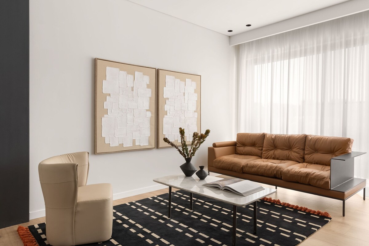 This sunny seafront apartment with easy mobility is located in the heart of the business and leisure district. Designed in the summer '19 by the host Architect in collaboration with a contemporary artist. The fusion of art & architecture in the apartment is felt throughout every object and detail. Intention: To redefine luxury by surrounding guests with collectors' items, green, beautiful colors art so the accommodation becomes an experience.
