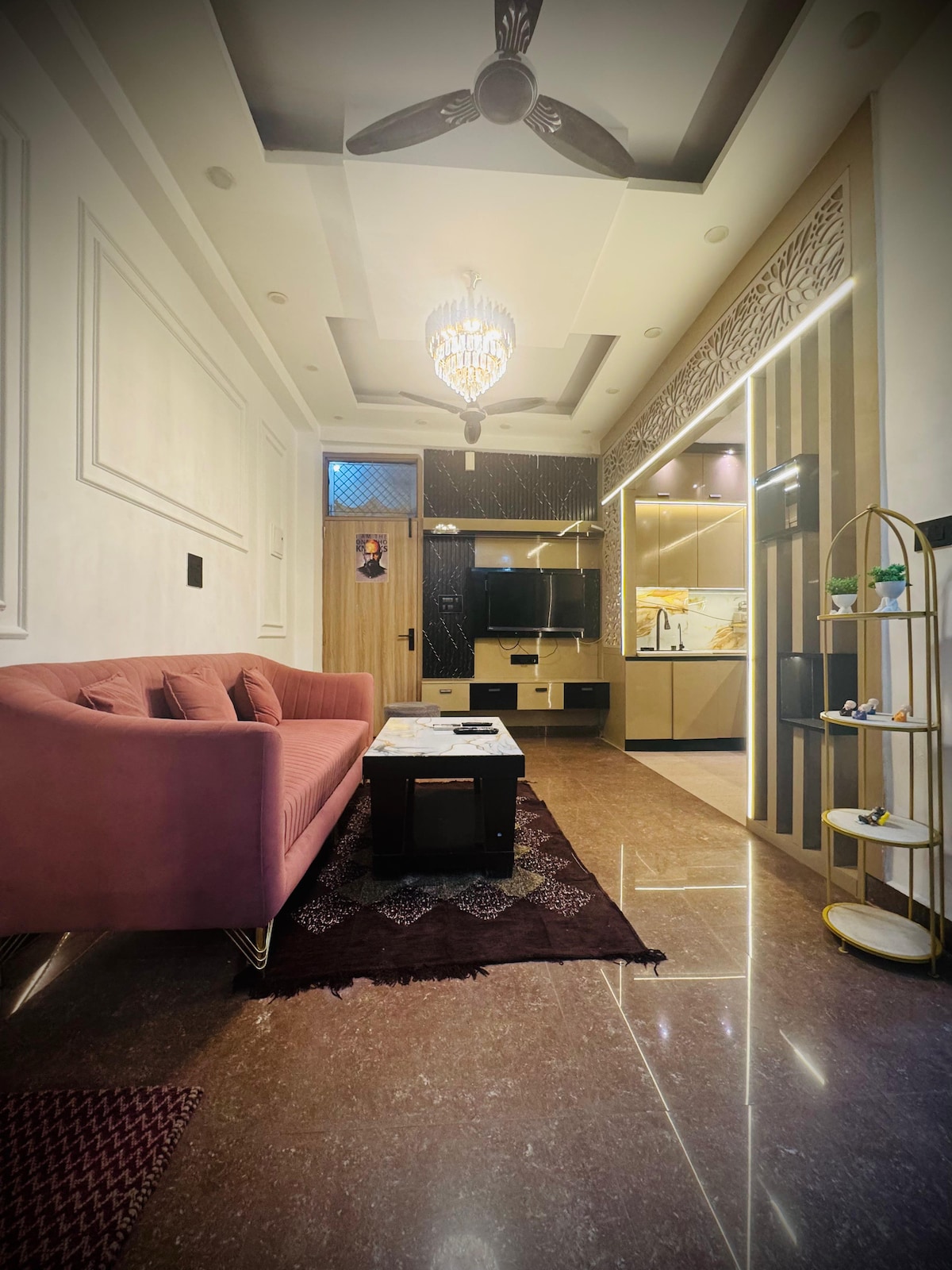 Our newly constructed 2 BHK apartment blends modern comfort with natural charm. The space features 2 serene bedroom with a queen-size beds, a spacious living room, a well equipped kitchen, 2 bathrooms: one attached to the master bedroom and another accessible from the living room and second bedroom and L- shaped balcony offering great view of the city. The property is located near a premium mall in Noida! This well-situated location offers you the convenience of shops, cafes, and entertainment.