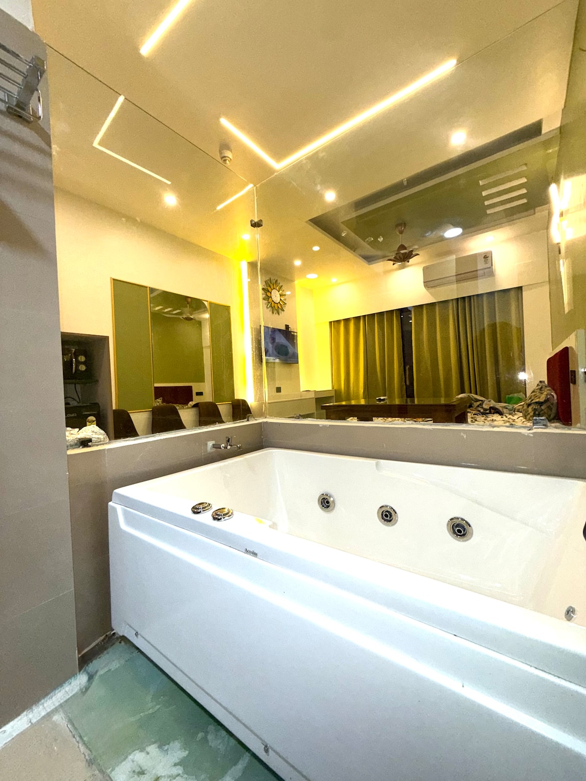 A Golf, Lake, sunrise & pool facing entire luxury apartment-Fully Furnished with Hottub, ACs, Heater, Airpurifier, Laundry, Fridge, LED, WiFi, Toiletries, Lift, fully functional Kitchen Oven, gasstove , RO, Utensils etc, Extra bed- Experience a mesmerizing stay in the nature at its best! This is 2 BHK beautiful apartment for homestay but Only 1 BHK (entire place) will be given. 2nd smaller room is locked. Breakfast - NA. Couple Friendly, Perfect for get together & day party! Cheers!