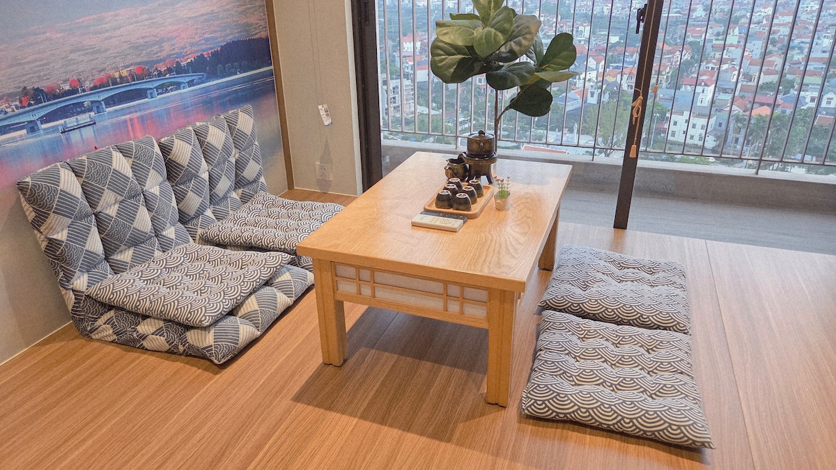 Step into a space that feels like wandering into a tropical forest. Warm wooden ceiling beams, vibrant palm leaf murals that seem to invite ocean breezes. A cozy double bed faces the elegant sofa, where you can enjoy movies on the large projection screen.Natural wood kitchen with charming rattan cabinet doors, pure filtered water system. Soft golden lighting and fresh greenery in every corner create an absolutely peaceful atmosphere. Additional benefits: 1. Free gym 2. 50% off for Onsen service