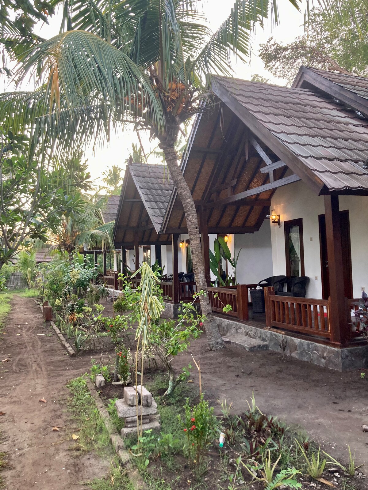 Beautiful and rustic private bungalow, with a garden view. 100m to a gorgeous beach, where you can snorkel with turtles. You will be served a delicious breakfast on the beach everyday, including a fresh fruit salad- part of the price of your stay. Short walk to a variety of activities, including diving and water sports. Easily rent a bicycle to get around the island. Fantastic sunrise location over the horizon. 5 identical rooms, enquire if listing is full. Others may be available.