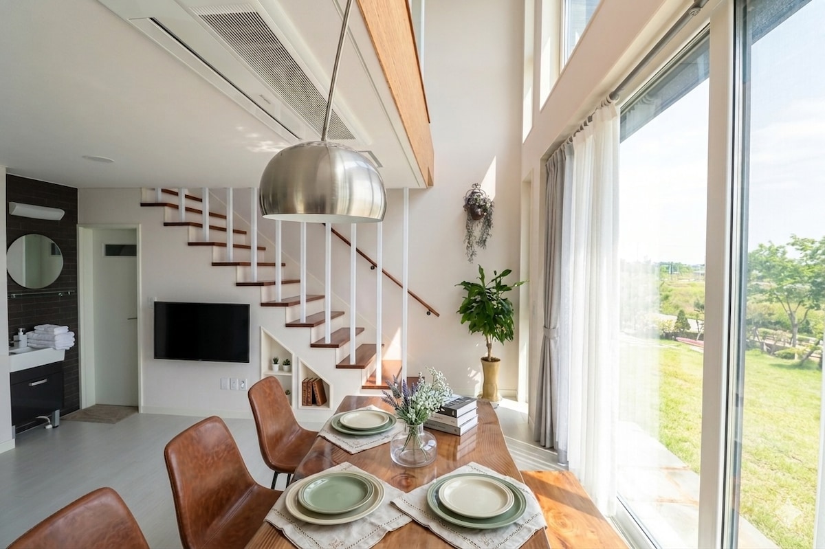 A space where you can rest in nature with four seasons There is a spacious lawn yard, and there are old houses in the distance. A dense pine tree forest in the back mountain ~ A place where chrysanthemum cosmos bloom in the sky from spring through the gaps in the stones ~ It is a place where you can wake up refreshed in the morning with the sound of birds. You can enjoy BBQ in the garden, drink tea in a white tent with a photo zone, and bloom the millet flowers that are blooming. At a 400-meter distance that can be seen right below, there is the currently trendy 2nd warehouse cafe and the spacious and wonderful Doonuri Cafe (1 minute by car), forming a holy alliance. At a 3-minute distance, there is the famous Okto Rabbit Space Center, a place where your trip can be healed with your children. There is also a small, cozy space on the second floor where you can drink tea while watching the mountain~