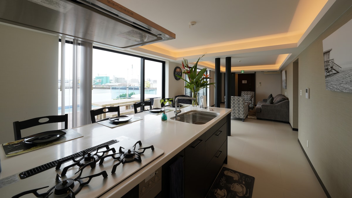 The concept of "LEQUIO - Ryukyu -" on the 4th floor of Riverside Terrace Okinawa Caden is "Ryukyu Modern"! You can feel the Ryukyu atmosphere unique to Okinawa. The complex hierarchy and construction, which has been thoroughly calculated, allows you to fully enjoy the interesting aspects of modern architecture. The ceramic panel objects by the Yachimun artist are decorated, and the atmosphere is like a museum. The top floor has a full outdoor balcony space, and the view overlooking the tall trees and the flow of the Hisha River from above is spectacular. It is an open private space that feels like you are in the sky. The terrace also has a barrel sauna made of high-quality Japanese cypress. You can use it as much as you like during your stay. You can also use the sauna, so enjoy an extraordinarily luxurious and relaxing "totono time" while surrounded by the scent and steam of cypress, listening to the birds chirping, and feeling the Okinawa breeze all over your body. (Instructions for use are available at the property) * Wi-Fi available * Free parking space for 1 car (a second car can be parked if no other guests' cars are parked) * Free for 3 years old and younger