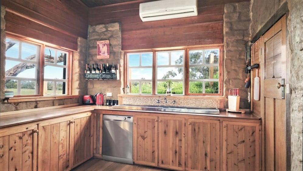 Escape to Driftaway Cottage, a charming mudbrick retreat nestled among trees and parklands, built into a limestone hill. This sustainable home, built in the late 70s, offers a peaceful haven with a unique blend of rammed earth walls, exposed wooden beams, and vintage telephone booth doors. The cottage radiates rustic warmth and coastal serenity, providing the perfect space to relax, unwind, and enjoy the natural beauty of its tranquil, secluded surroundings.