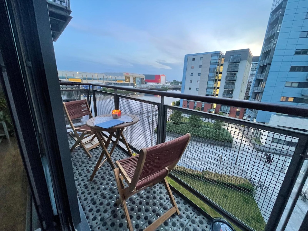 Bright, modern apartment within an award winning development built in 2007. Fast 5G WIfI. Terrace looks out over the river clyde, close to the SECC and Hydro and is a 10/15 minute walk from the heart of the west end in Glasgow. City Centre is a 10 minute taxi ride. Patrick Tube station is 10 min walk, 30-40 minutes from Glasgow Airport. The Apartment block has 24hr CCTV. New kitchen and appliances. Tea/coffee included.