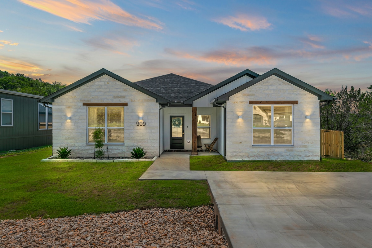 Stylishly appointed, new home near Lake Granbury. Great room with electric fireplace & TV, perfect for relaxing as you look out to the wooded area in back where cardinals & squirrels welcome you. Well stocked kitchen and formal dining. Three bedrooms with king, queen, two twins & a pull-out sleeper sofa. Room to sleep eight, but perfect for a couple's getaway. Short walk to the lake, picnic areas & boat dock access. Private home in Canyon Creek gated community with no neighbors on either side.