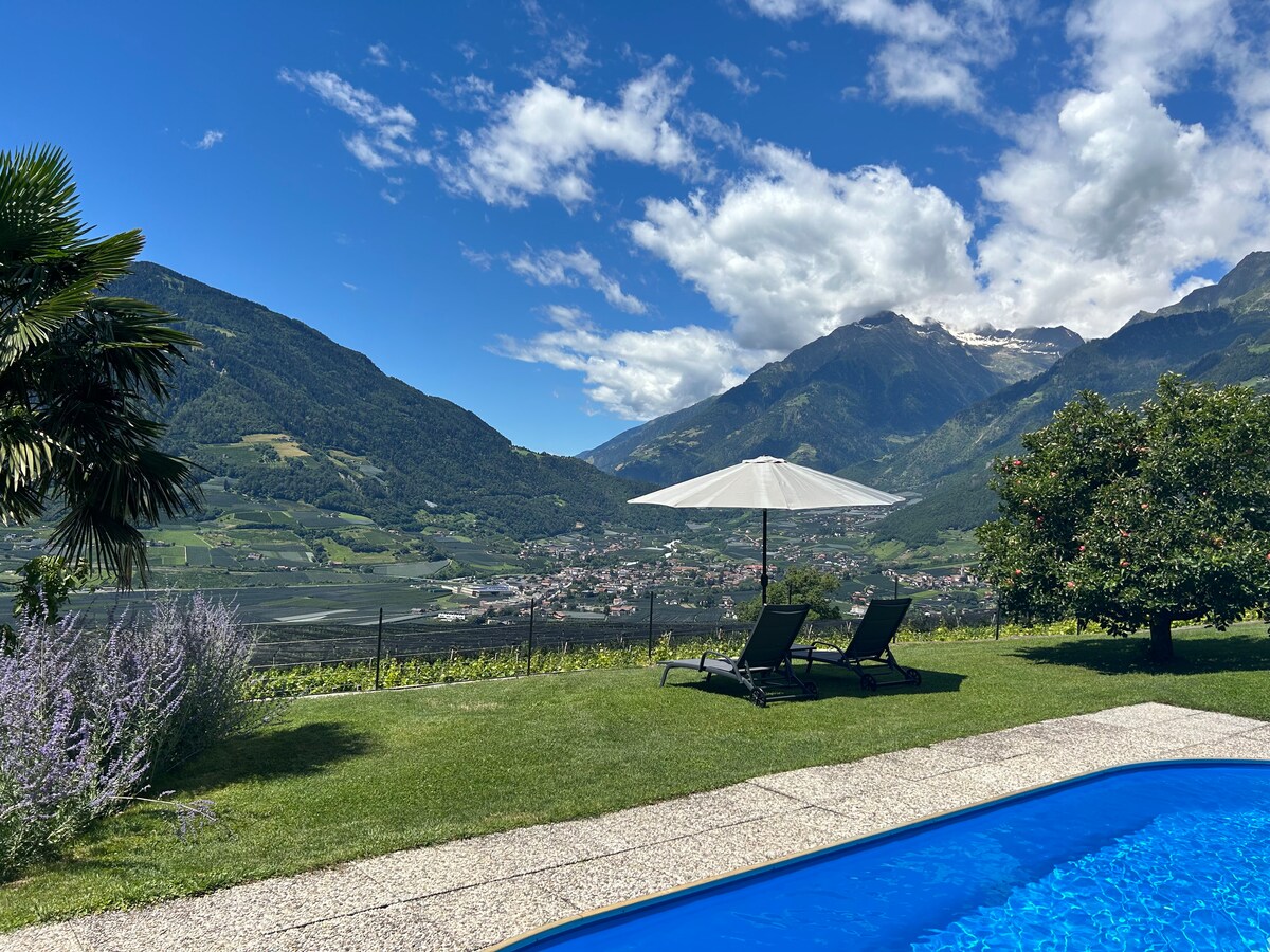 A gigantic view, a private terrace and two stylish apartments. Where there was once a large meadow with ferns, our "farnhaus" now stands, surrounded by nature, quietly located and yet quick and easy to reach. In front of us stretches the entire Adige Valley, a spectacle at any time of the day or night, and Merano and Tyrol Castle are at our feet. A perfect starting point for hikes and beautiful walks.
