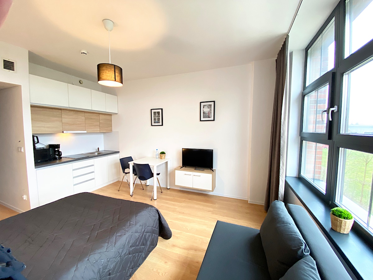 A modern and functional apartment, decorated with attention to detail. It consists of a living room with a kitchenette, a bedroom, a dressing room, a bathroom, and a balcony. The apartment is fully equipped and perfect for sightseeing, business trips or romantic weekends. Only a 15-minute walk to the market.