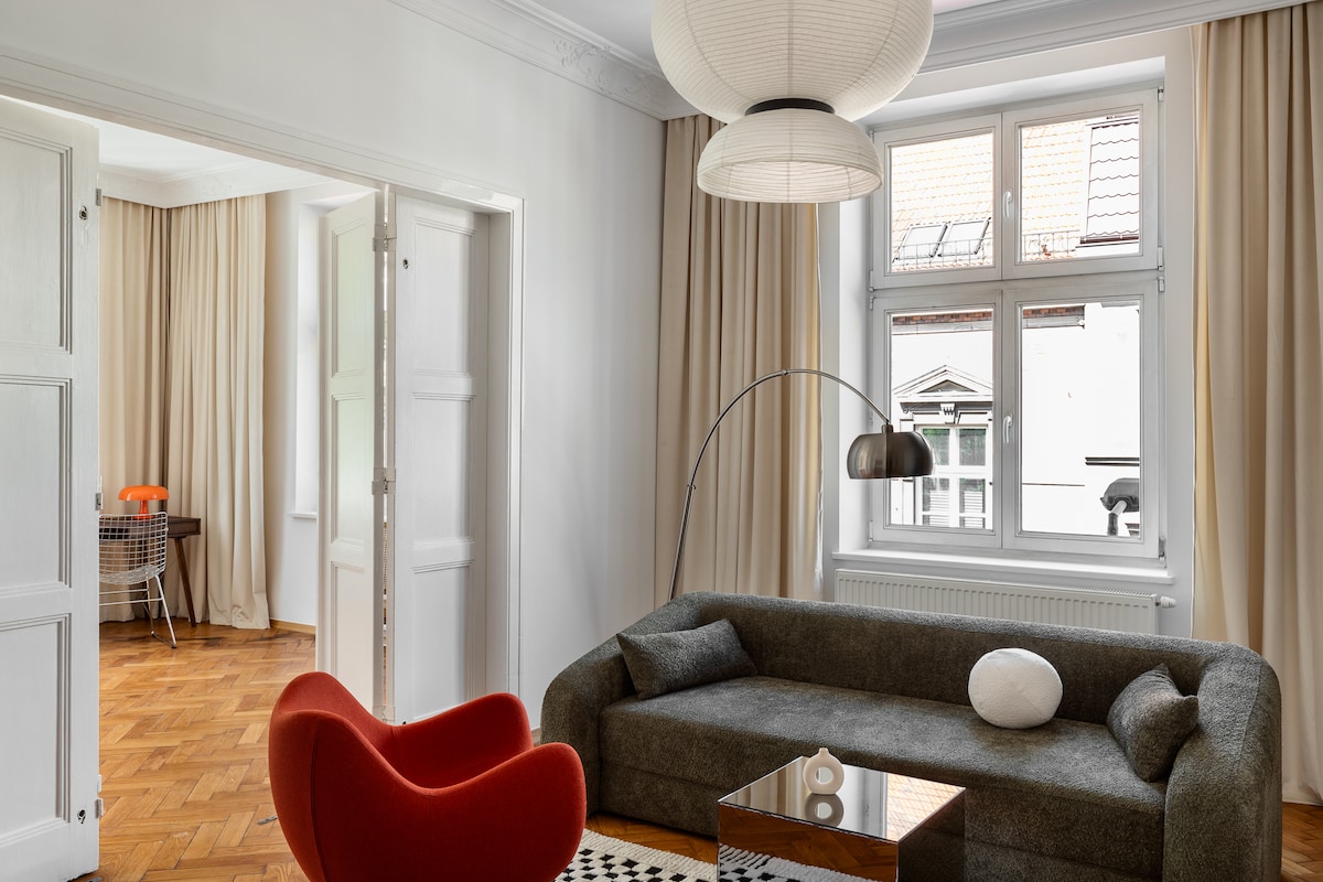 The apartment is set in a beautifully renovated historic townhouse dating back to 1910. Its location is truly special, perfectly positioned between the Old Town and the historic Jewish Quarter, both just a three-minute walk away. You’ll be surrounded by hundreds of cafés, bistros, and bars to explore, while the street itself remains peaceful and quiet. The main train station is just three tram stops away, and the suburban rail station with direct airport connections is within walking distance.
