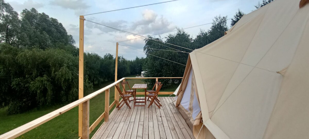 Miła Łąka consists of three cotton glamping tents equipped with furniture and electricity. We chose a quiet place for them, sheltered by trees, overlooking the lake. Our farm is about 80 m away. At the barn wall you will find a bathroom and an equipped summer kitchen. We offer you a few hectares of meadow with the shoreline of Lake Miłkowskie. Fireplaces by the lake, a private pier, kayaks, deckchairs, space - all this creates the unique atmosphere of our Miła Łąka.