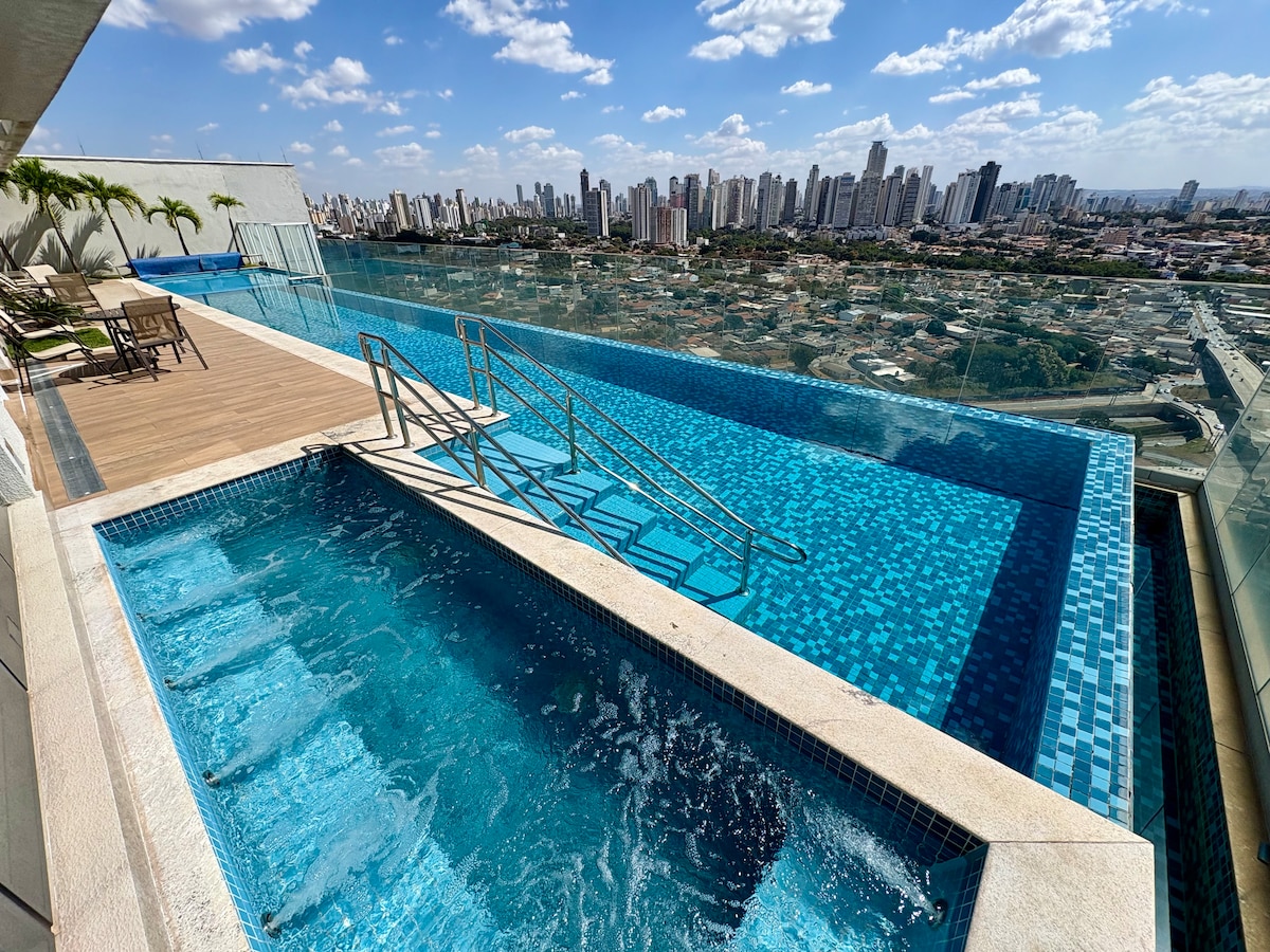 -Great location close to malls, gastronomic hub, clinics, airport connection routes - Restaurant bar on the ground floor - 24-hour Reception and Valet Parking -Amenities: Air Conditioning, Bedding, Towel, Iron, Hair Dryer, Laundry, Minibar, Microwave, Dishes, Glasses, Cutlery, TV, Wifi, Sofa, Covered Garage -Leisure: Swimming pool, Sauna, Complete gym -Front to the sunrise, Well ventilated, 11th floor, Beautiful view of Goiânia