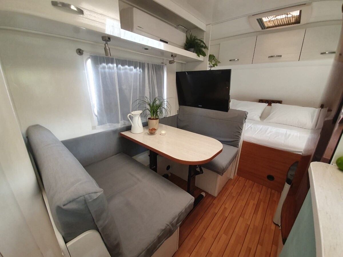 Camper located on a farm. The location is near great hiking trails and not far from Haifa. The camper can sleep up to six people and is fully equipped with a kitchen, bathroom with a hot shower, dining table, bbq, etc. The location is great and there are plenty of places of interest to visit in the area.