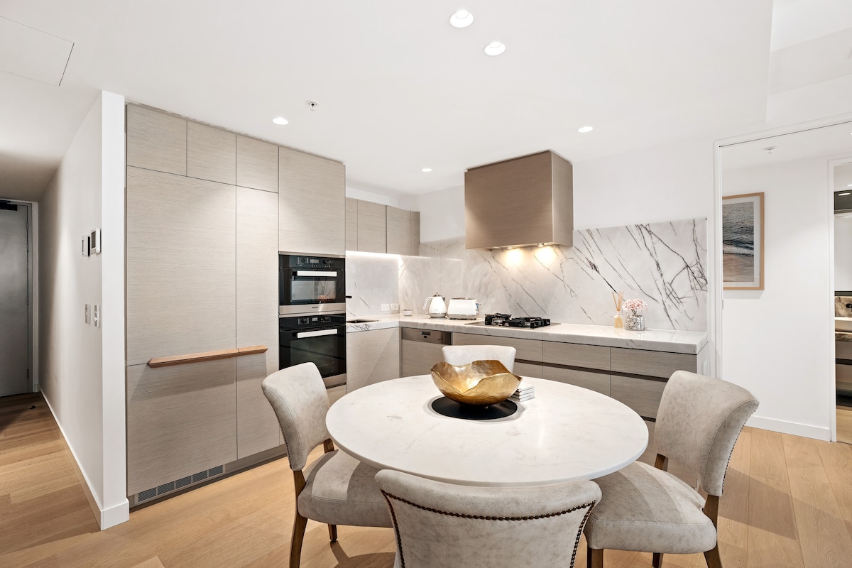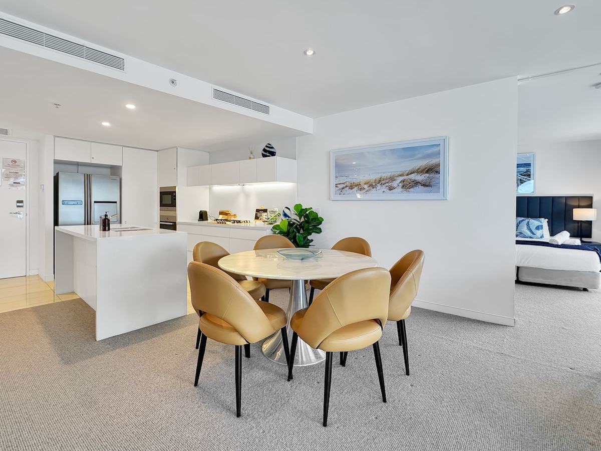 * Stylish & Colourful, Modern, GORGEOUS * Sweeping Views in ‘all’ directions (see photos). Simply STUNNING * Gorgeous NEW Ocean-themed bathrooms * FREE fast WIFI & Netflix & Parking * Beach So close! * Surf Club, Great Dining! * Bicycle coast path, 4 bicycles FREE for you, e-bikes for hire. * Easy access to Trams & Buses, Restaurants & Cafes, Theme Parks, Outdoor Adventure * External pool & spa, tennis court, BBQ area freshly renovated 2025. * Internal gym, sauna, heated pool & spa