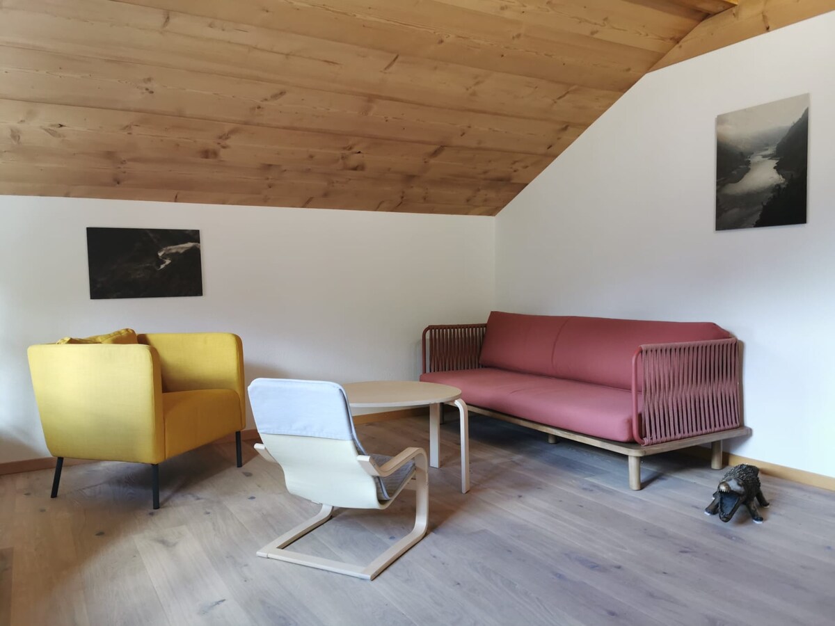Relax in this luxurious, quiet, child- and dog-friendly flat above the Safrandorf Mund in the Valais. Situated 1400 metres above sea level, you have a fantastic panoramic view of the mountains, the valley below and a clear view of the Matterhorn. In winter, away from the hustle and bustle of the pistes, but still only 25 minutes away from the ski area, you can go snowshoeing, sledding or build an igloo. In spring, a super hiking area with the Aletsch glacier, Safrandorf Mund, famous suonen ...