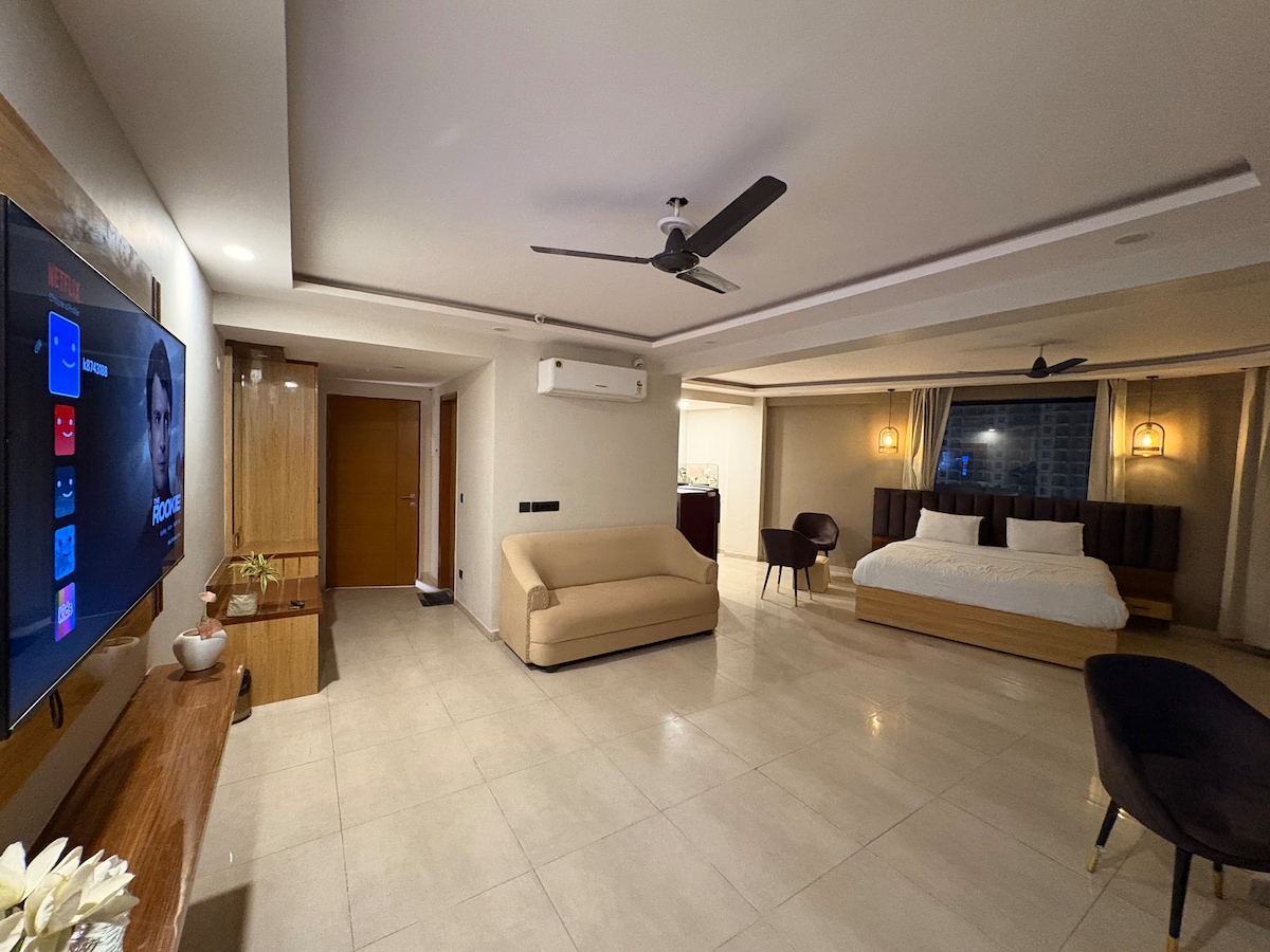 ♂Settle down in the comfort of an elegantly designed Studio apartment, even bigger than any hotel room, with the advantage of its own in-suite Kitchen, in the heart of Gomtinagar. This 2nd flr modern studio apt is ideal for 4 guests. Its large bay windows and glass balconies open up to the greenery and hustle bustle around the property. Shopping malls, supermarkets, eateries, stores, laundries etc. are mere walking distance from this place, for your convenience.