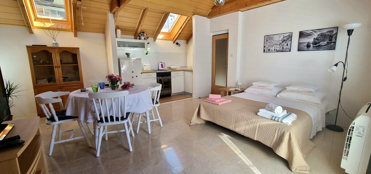 Comfortable and modern loft on perfect location, only few steps from the city walls and Ploče gate, with the most amazing views of the Old town, sea and the island of Lokrum. It consists of 2 double bedrooms, bathroom, toilet, fully equipped kitchen, office and specious dining and living room area with terrace overlooking magical roofs and Old port of Dubrovnik. Located just above the Old town in Ploče area, all major attractions and beaches are walking distance.