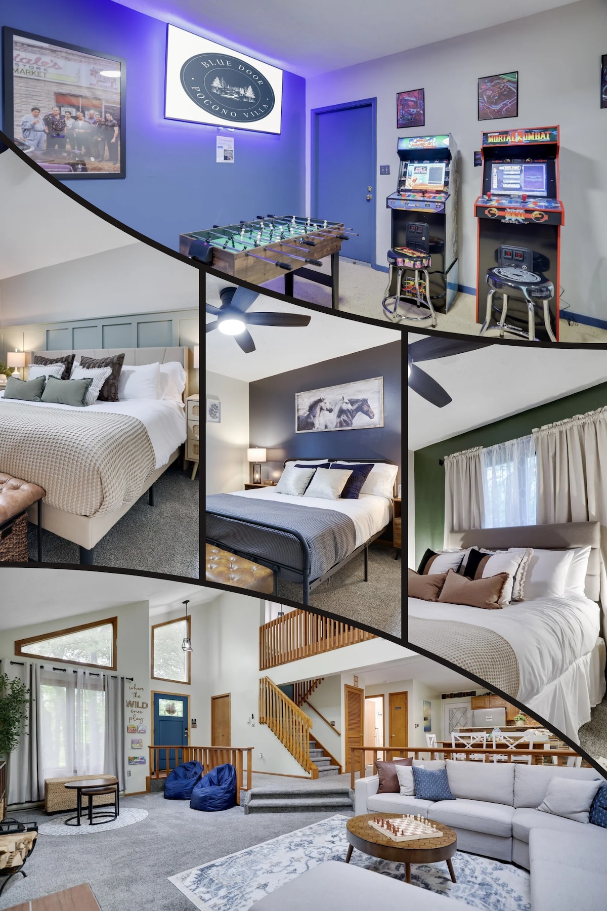 Escape to a cozy fall getaway near Kalahari, Mount Airy Casino, Crossings Outlets, Lake Wallenpaupack, & Tobyhanna State Park 2 miles away w/ fall foliage, & mountain air, lake views, wildlife, & picnic spots. Nestled off a rugged private road. This spa style retreat has a soaking tub, rain shower, smart lights, kitchen w/ smart stove, plush beds, LED mirrors w/ music sync, & retro arcade fun. Perfect for couples, birthday getaways or families seeking a peaceful Poconos stay w/ modern amenities.