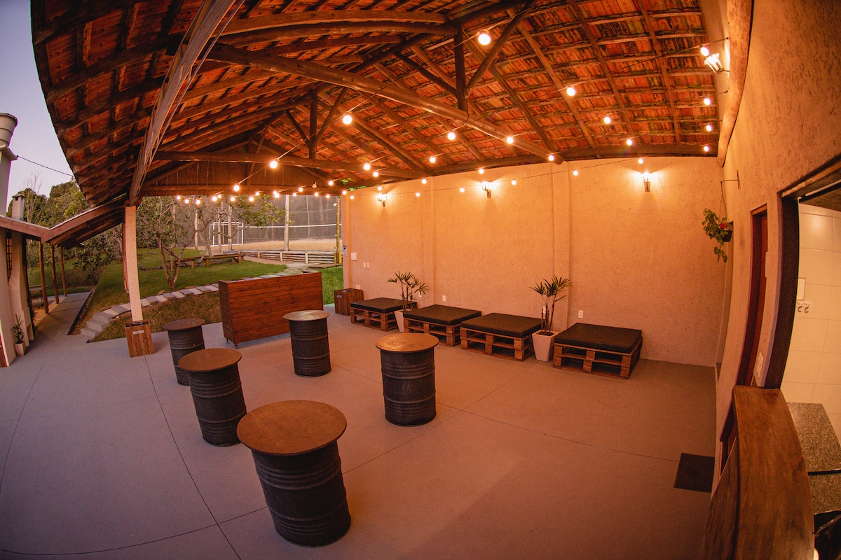 Relax with the whole family at this unique and peaceful place, where you can wake up integrated with nature, listening to the birds. A complete and cozy house, with an indoor fireplace, 4 bedrooms, 3 of which are suites facing the lake, beach tennis court, swimming pool, fire pit, games room with foosball, ping pong, and air hockey. Jacuzzi, pool table integrated into the dining and living room. Barbecue, stove and wood-burning oven... in short, an incredible place, with a whole house connected to nature and you!!