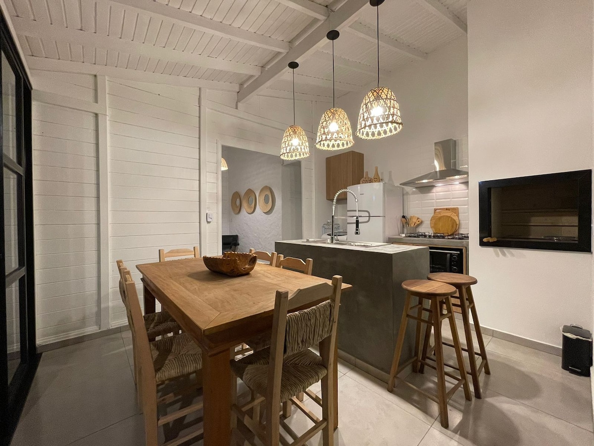 O chalé é totalmente equipado para uma estadia confortável e inesquecível: Quarto • Quarto aconchegante com sacada e vista para o pôr do sol Sala • Sofá confortável para relaxar depois da praia • Smart TV • Ar-condicionado Cozinha completa • Utensílios para preparar refeições completas Banheiro • Chuveiro com aquecimento a gás Relaxamento • Banheira de hidromassagem para momentos de descanso a dois À noite, o clima é silencioso com céu estrelado e a brisa suave vinda do mar.