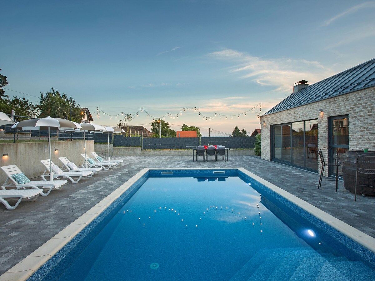 Smještena u mirnom okruženju nedaleko od Zagreba, naša kuća nudi savršen spoj opuštanja i zabave za cijelu obitelj. Uživajte u bazenu, prostranom dvorištu, spa zoni i brojnim sadržajima-od kutka za roštilj i opuštanje za odrasle, do prostora za igru i zabavu za djecu. Svaki gost može uživati u toploj i domaćoj atmosferi s prekrasnim pogledom i osjećati se kao kod kuće.
