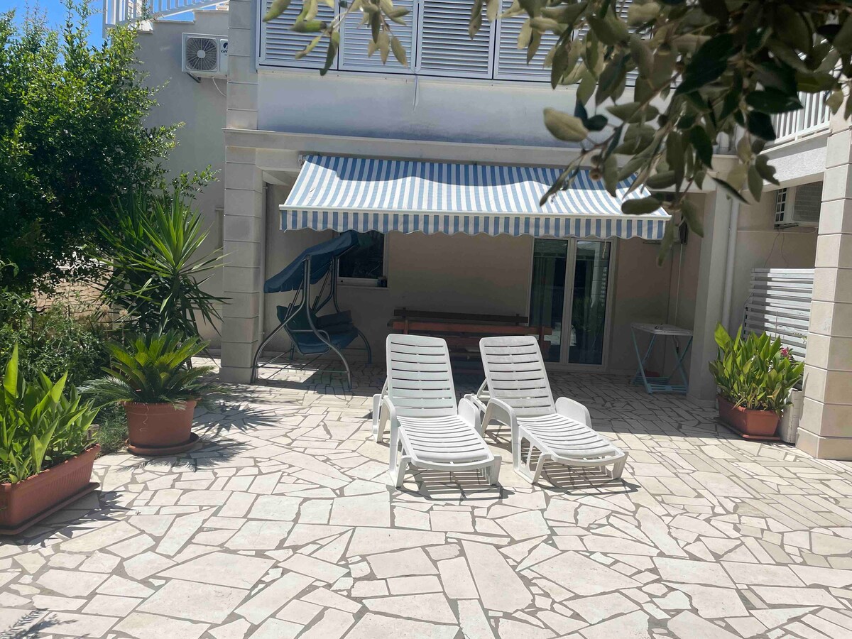 Hell und freundlich erwartet Sie unsere komfortable Wohnetage mit zwei Apartments à 50 qm und jeweils 4 Betten und mit zwei zusätzlichen Hilfsbetten bei Bedarf. Das Haus, in welchem sich die beiden Apartments befinden, liegt in einer ruhigen Einbahnstraße. Es ist beidseitig von einer großen Außenterrasse umgeben, welche im hinteren Teil des Hauses, an einen dicht bewachsenen Wald grenzt und somit ungestörte, erholsame Stunden bietet. Ein ausreichend großer Privatparkplatz bietet vor dem Haus Platz für Ihre Fahrzeuge. Die klimatisierten Apartments verfügen über jeweils zwei Schlafzimmer mit je einem Doppelbett und zwei verrückbaren Einzelbetten, einer voll ausgestatteten, offenen Küche einem gemütlichen Wohnbereich mit TV, Flur sowie einem Duschbad mit WC und Fön. In der Küche sind Kühlschrank, Kochfeld, Backofen und eine Spüle integriert. Handtücher und Bettwäsche werden gestellt. Die Wohnungen sind durch separate Eingänge zu erreichen und sind lediglich durch die Außenterrasse miteinander verbunden. Die Wohnetage bietet sich ideal für befreundete Ehepaare, oder eine größere Gruppe an. Abseits des regen Treibens am Strand oder in der Stadt bieten Ihnen verschiedene Sitzgelegenheiten im Garten eine kleine Oase der Entspannung die Sie ganz nach Ihren Wünschen z.B. zum Frühstücken nutzen können. 500 m trennen das Haus vom kristallklaren und für seine Sauberkeit bekannten adriatischem Inselmeer mit Kiesstrand und naturbelassenem Buchten.