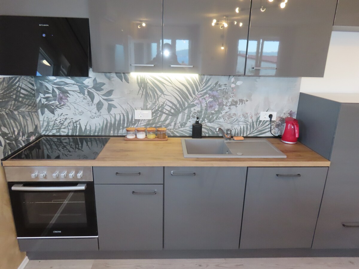 This bright & stylish apartment is located in Novi Vinodolski and only a few minutes walk from seaside, shops, bars & bus station. It is an ideal hub for spending the summer at one of the most beautiful towns in Adriatic & exploring all of the tourist sites in this region of Croatia. The apartment has everything to make you feel at home - designed in modern style, WiFi, AC, TV, washer, kitchen with all accessories - it is ideal for 4 guests with its 2xKing size beds.