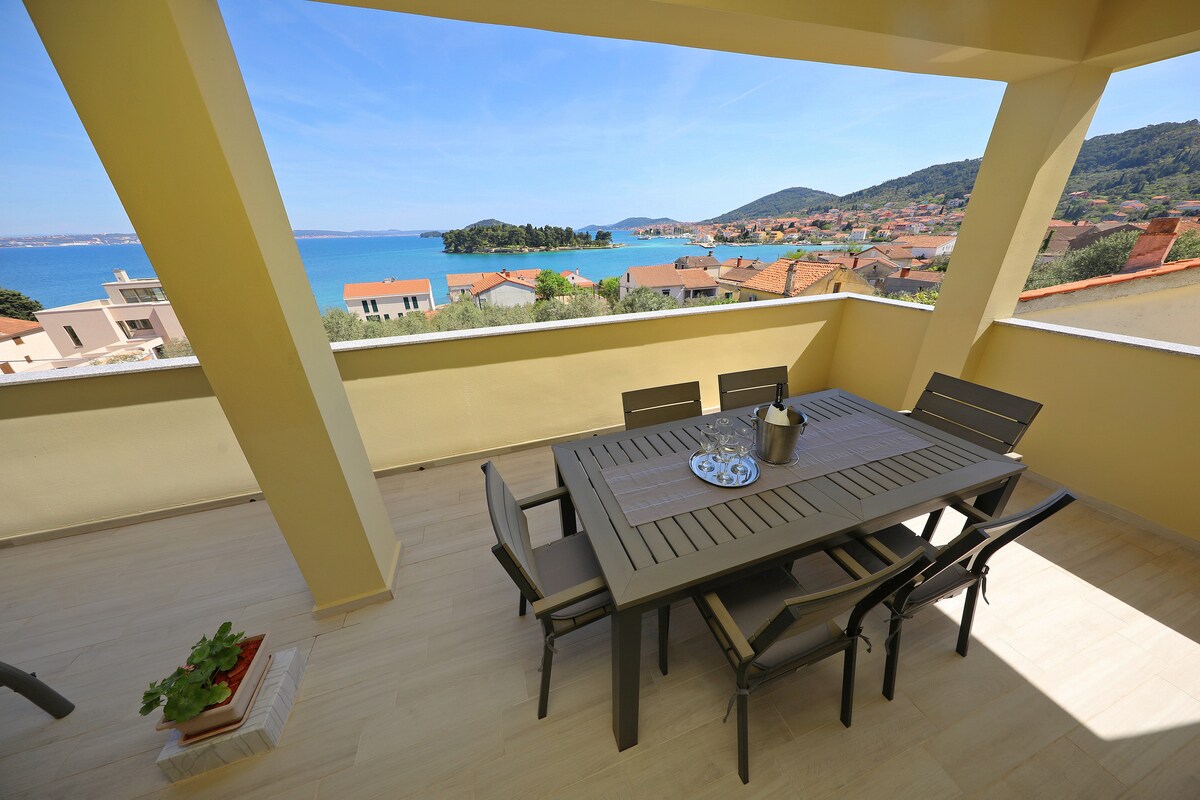 It has a beautiful view of the sea where Kraljičina and Ždrijac beach meet, the entire city and Velebit montain. The apartment is luxuriously and modernly decorated and consists of two separate bedrooms, kitchen, dining room, living room, bathroom and a large terrace. Private roof terrace with jacuzzi and barbecue. sunbeds and umbrellas. It has wifi ,free parking ,air-conditioned. Has underfloor heating throughout the apartman and a home cinema. Free parking ticket