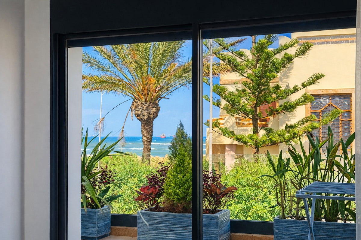Maison lumineuse à Mohammedia – face à la plage et accès facile aux matchs CAN 2025. À 5 min de la gare de Mohammédia! Faites une pause et détendez-vous dans cette jolie villa à l'esprit minimaliste et au charme naturelle. La maison donne accès directement sur la plage de Manesmann. Elle est située dans un lotissement calme et sécurisé à 3 minutes en voiture du centre ville de Mohammédia. Les moments de repos sont bercés par le bruit des vagues et le chant des oiseaux.