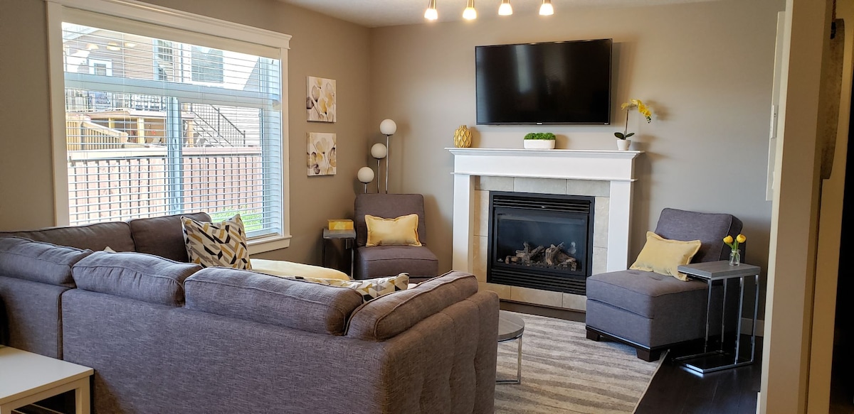 This stylish place to stay is perfect for group trips. Walking distance to grocery store and restaurants. This pet friendly home has everything you need. Fully equipped, bright and spacious! This place has four bedrooms which all have queen beds, two baths and two full living room spaces. This makes this house the perfect space for families. This house includes a large parking space for two large vehicles, large backyard and BBQ deck space. Can sleep a total of 9 people with pull out couch.