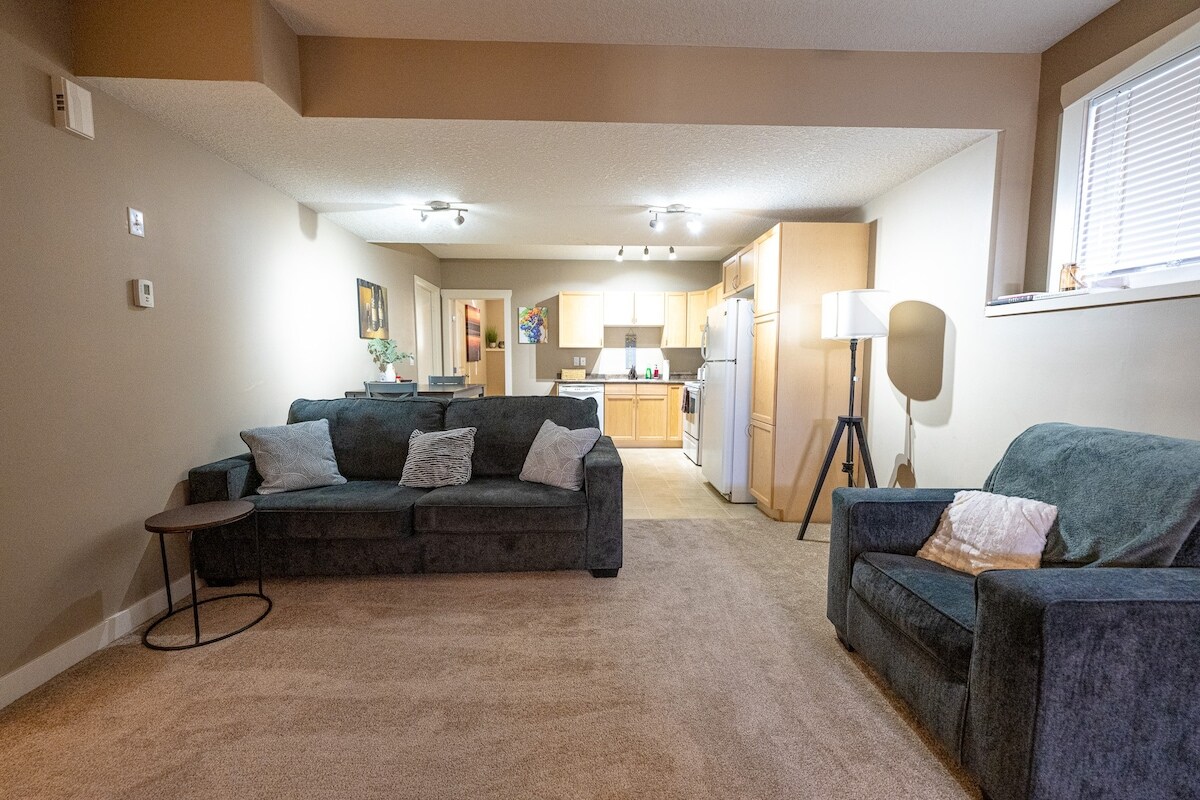Enjoy a complimentary wine in our spacious wine-bar suite in Westgate, by the airport. 1 bedroom suite with a full kitchen, washroom, laundry room, 2 living areas, & garage. Kitchen has all appliances including dishwasher, living area has a 65" smart tv, laundry room includes washer/dryer, and bedroom has a desk/office chair. Suite has high ceilings, huge windows, no neighbors on 3 sides, playground/park/lake with running track across the street, and no carpet so easy cleaning for kids & pets.