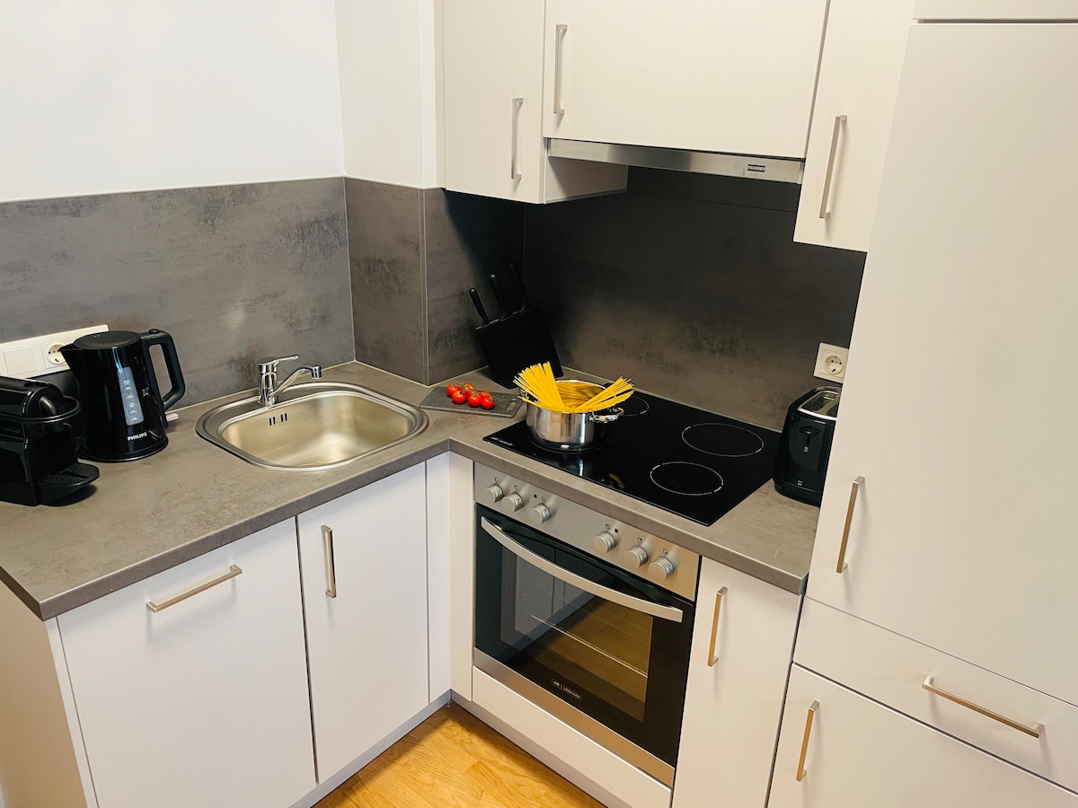 This charming garden apartment is located in the heart of the city, right next to the Technical University, combining urban comfort with a quiet setting. Two bright rooms with direct access to the garden, a modern bathroom with bathtub and shower, and a fully equipped kitchen ensure a relaxed stay. Both the living and outdoor areas offer dining tables for three, plus a sofa bed and a small storage room. A Smart TV and high-speed fiber Wi-Fi make it ideal for longer stays.