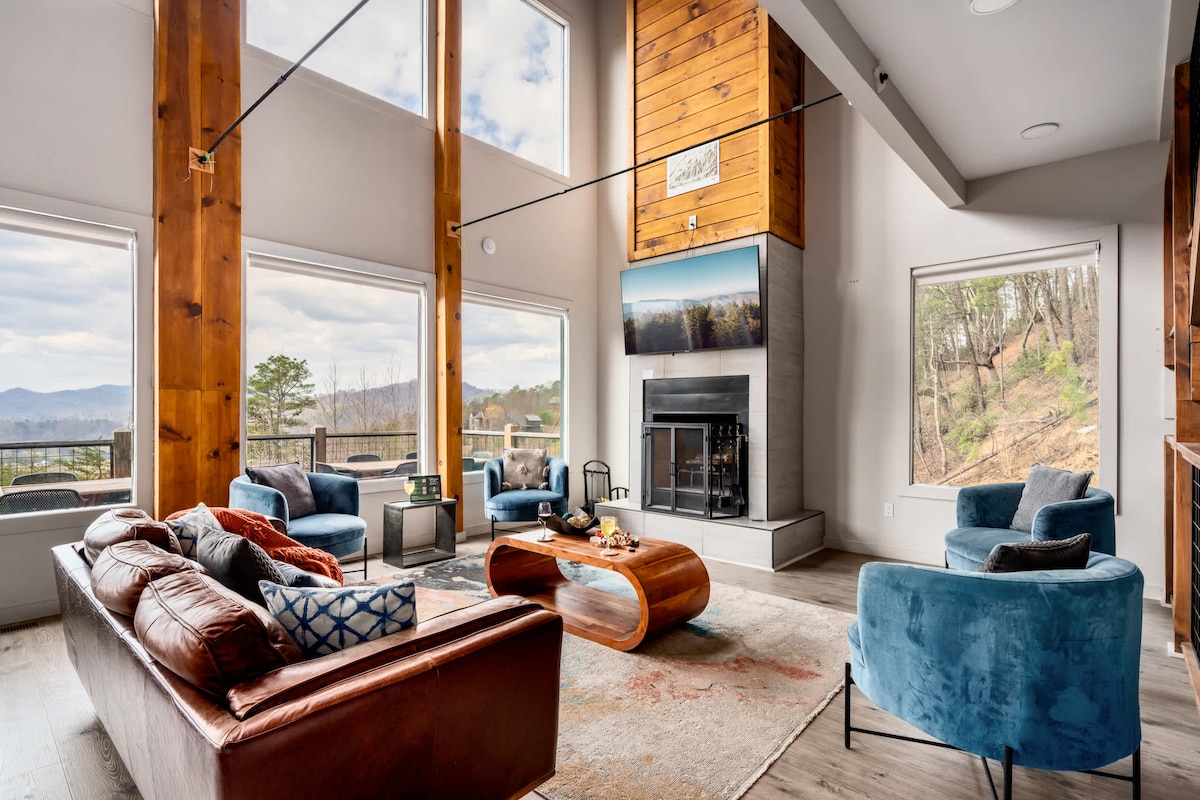 Experience unparalleled luxury at Windows to the Mountains, a modern marvel nestled in Gatlinburg with stunning views of Mt. Leconte. Chalet features a rooftop deck with a modpool, movie theater, and exquisite outdoor amenities. Enjoy a fully-equipped kitchen, cozy living room with a vapor fireplace, and a master suite with a spa-like bathroom. Complete with a coffee bar, game tables, and a sauna, Windows to the Mountains offers an exclusive retreat for discerning guests seeking a lavish escape.