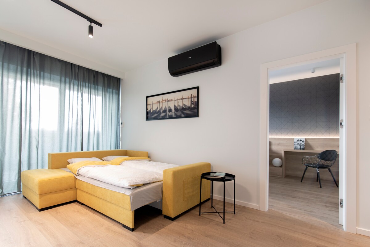 PLEASE NOTE: IN JANUARY 2026 THE POOL AND SAUNAS WILL BE CLOSED FOR MAINTENANCE! The apartment consists of a large living room with a kitchenette, a dining area and a desk. The large bedroom is equipped with a 160x200 cm bed. The 2nd bedroom is equipped with a designer bunk bed. Both 120x200 cm. Guests of the apartment can use the swimming pool, dry and wet sauna, salt and ice caves, a small gym for free and, for a fee, a closed, large gym and a luxurious SPA zone.