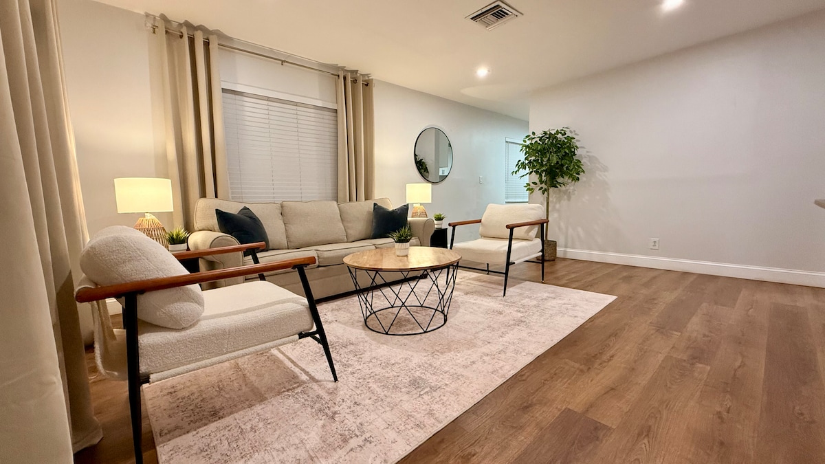 Experience deluxe comfort and modern style just a 10 minute drive to the beach. You'll love the unique custom kitchen countertop and 2 cozy beds. We've thought of everything to make your stay comfortable, 65" 4K smart TV, washer/dryer, 2 dedicated parking spots, a private patio, and a fully equipped kitchen. There's a dedicated work desk and high speed internet. Hydro-jet shower system and lit mirror in the bathroom, color-changing mood setting mirror, impact windows, central AC, noon checkout.