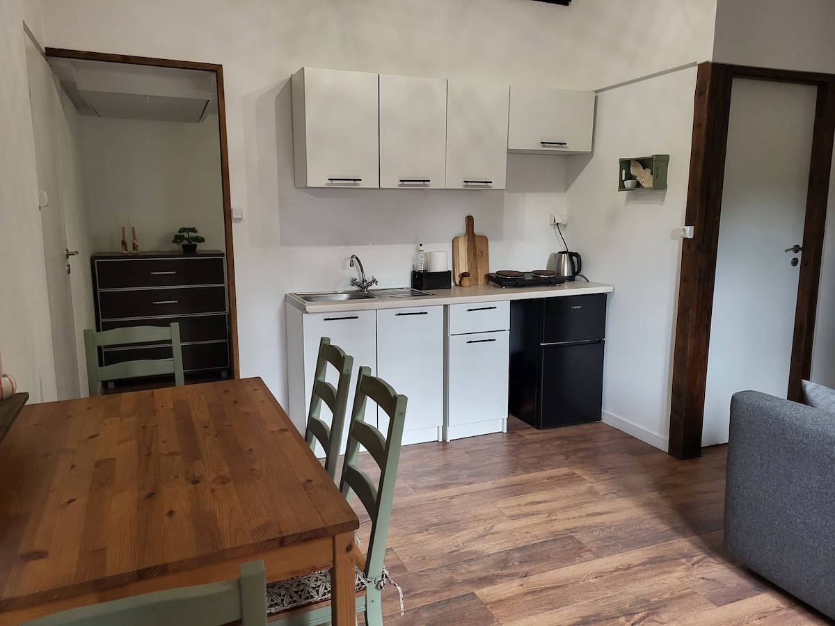 JolieFolie is a unique place to relax in an idyllic climate, close to nature. It is an ideal space for organizing intimate events. We offer a house surrounded by a garden with a place for a bonfire. The interior creates a two-storey space. The 75 sqm ground floor includes a fully equipped kitchen with dining room, bedroom, bathroom with shower, and living room. The first floor is a climatic mezzanine - an ideal place to relax (50 sq. m.), with a bedroom, bathroom (bathtub). Accommodation for a group: 6-8 people.