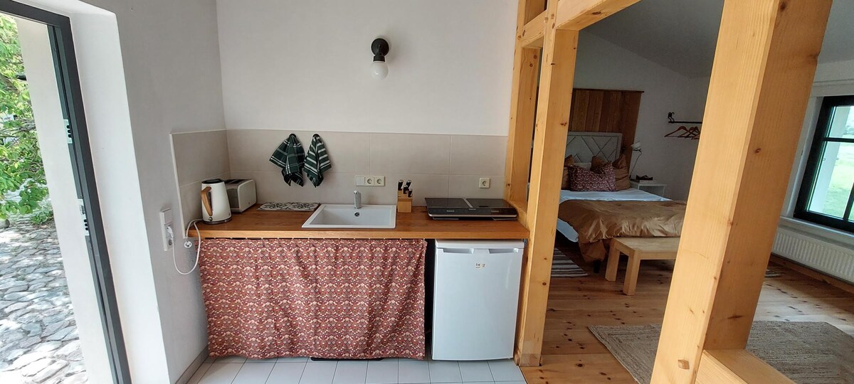 Our cozy vacation apartment for two people is located in an ecologically built residential building in the small village of Möllen. In addition to an approx. 25 square meter room, it has a separate entrance, with hallway and shower room and a small cooking facility. From the apartment you have a beautiful view of Lake Schwielochsee. In the large garden there is a separate cozy sitting area & sun lounger and the jetty at the natural lake invites you to fish, sunbathe and romantic sunsets.