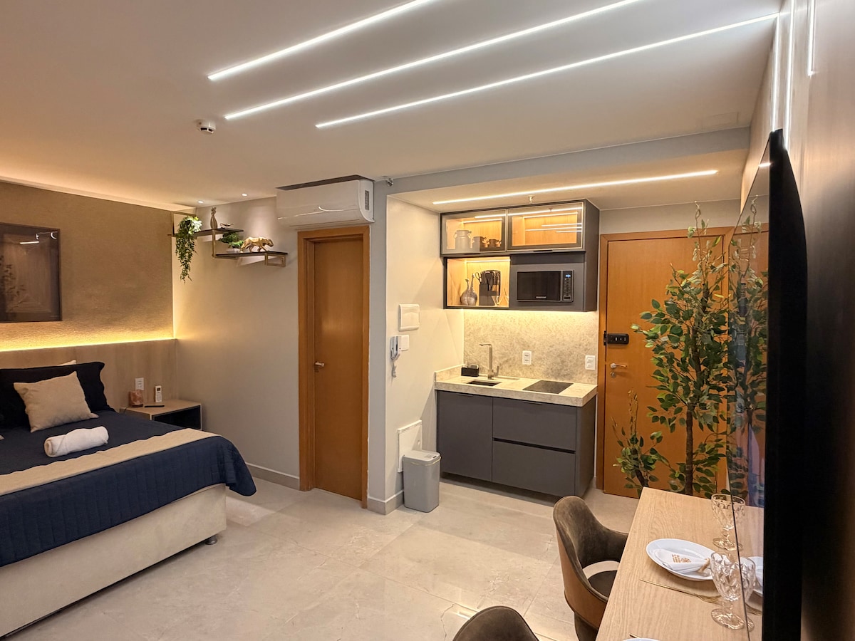 Close to the airport, subway station and the best mall in Brasilia. Easy access to shopping and leisure centers. Cozy and tasteful, private parking, Wi-Fi, cable TV, Netflix, air-conditioning in the living room and bedroom, microwave, electric oven, stove, refrigerator, equipped kitchen. The condominium has the option of 3 restaurants with a varied menu and breakfast, lunch and snacks, as well as a 24-hour self-service convenience store. Swimming pool, Sauna and Gym. All new furnishings.