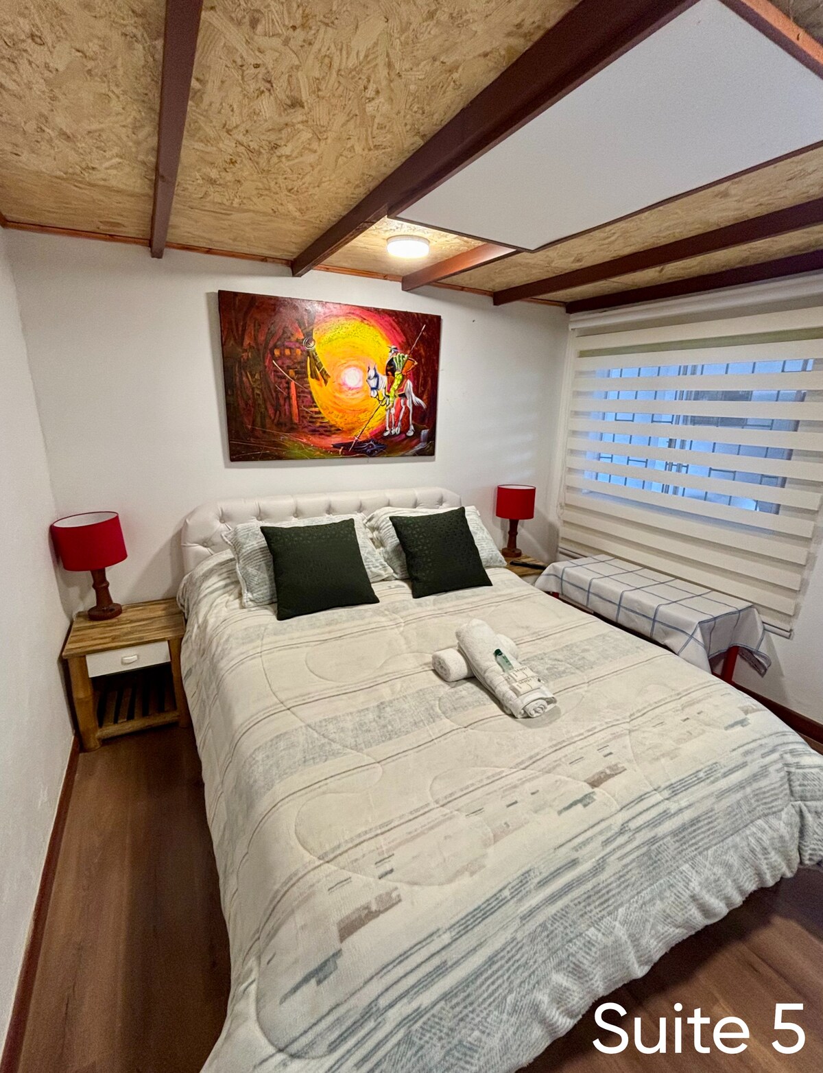 Acogedora habitación que combina el encanto colonial de Sopó con un diseño moderno. Tiene piso de barro cocido, vigas de madera y tonos neutros que crean un ambiente cálido y relajante. Cuenta con cama queen, televisor de 54”, ventanales curvos con vista al jardín, closet abierto y perchero. El baño privado ofrece doble lavamanos, tina y espejo con luz LED. Ideal para parejas o viajeros que buscan descanso y estilo en el centro de Sopó.