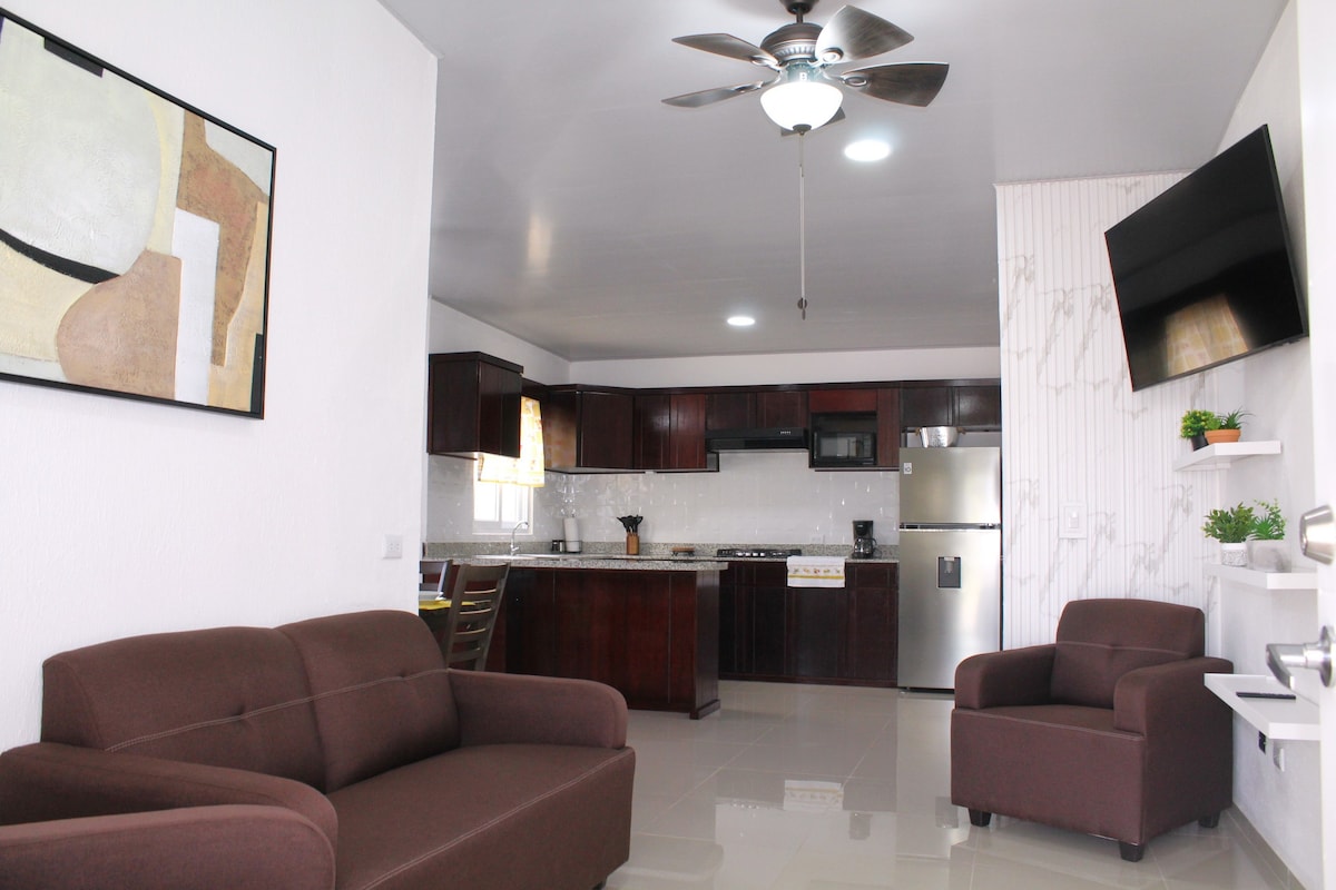 Comodo y acogedor espacio ideal para familias pequeñas hasta 5 personas con todo lo que necesitas, ubicado en una residencial tranquila y segura sin ruidos a solo 2 minutos del Periférico Gerardo Barrios. Contaras con utensilios de cocina, cocina con horno, microondas, refrigerador, 2 comodas habitaciones, baño completo y una hermosa terraza con hamaca , sofa cama, TV e internet de alta velocidad de hasta 200Mb. Cochera para 2 vehículos, piscina comunitaria y parque para niños.