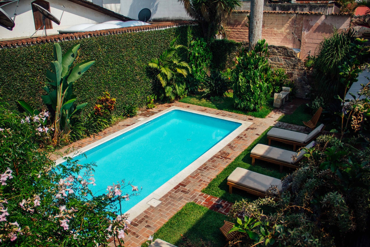 Experience the heart of Antigua in comfort from this luxurious 6.5 bedroom home featuring beautiful gardens, large patios with volcano views, a private casita, a wood-burning sauna, pizza oven and swimming pool! Your group will have ample room to relax and enjoy this spacious property located in central Antigua. Just 3.5 blocks from the Central Park, you'll be in walking distance of most everything Antigua has to offer. Daily maid service and parking for 2-3 cars is included.