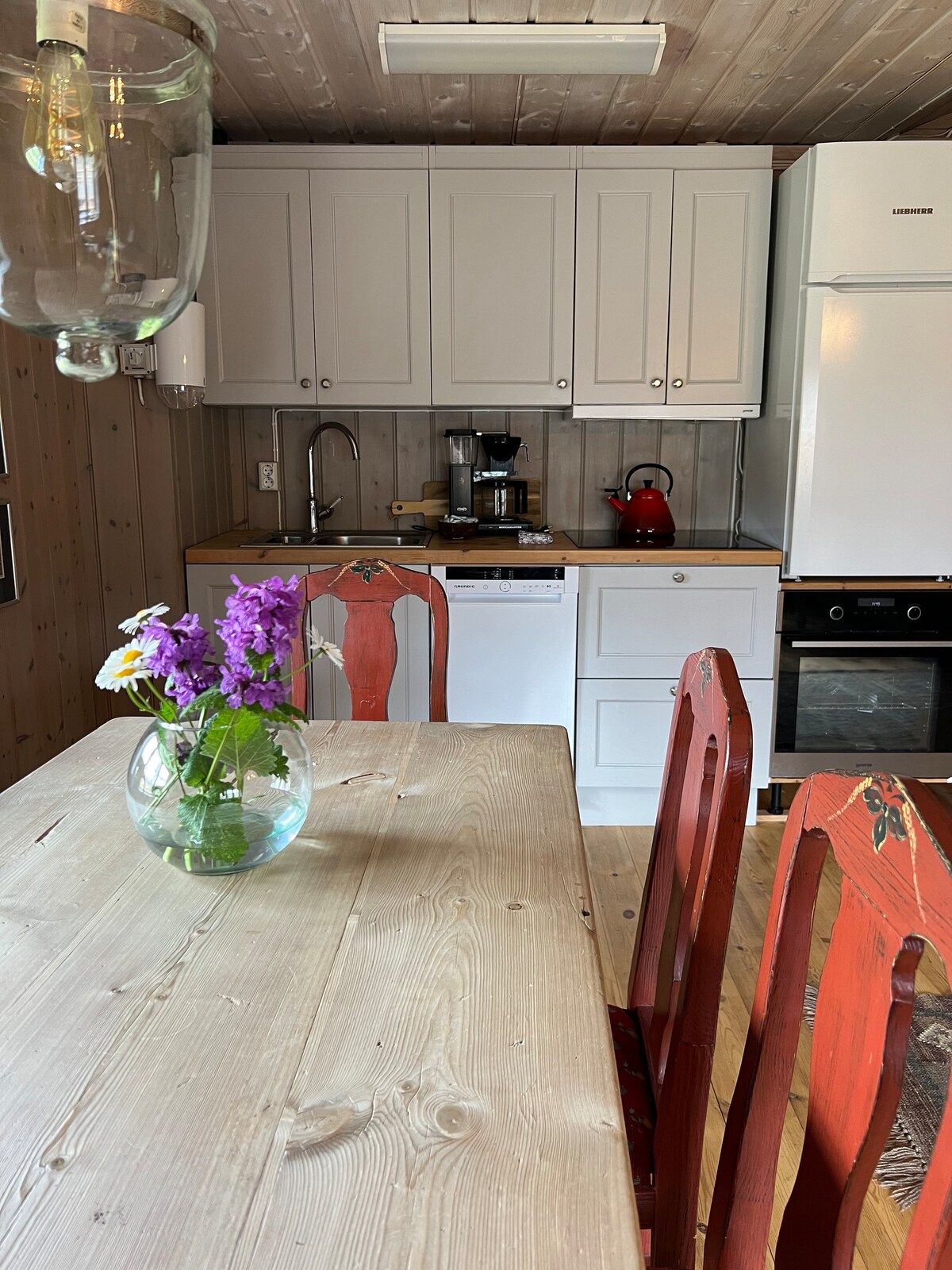 New annex with a living room with sofa bed and kitchen. The kitchen has a mini fridge and gas stove. Quiet, beautiful and open forest terrain with a short distance to fishing/swimming opportunities - only 150 meters from Gudbrandslågen. Great trails in the area. 4 km from Dombås city center. There is a road to the annex. With electricity, running cold/hot water, toilet and shower. There are duvets, pillows and bed linen in the annex. The road address can be a bit complicated, please contact me for a detailed description.