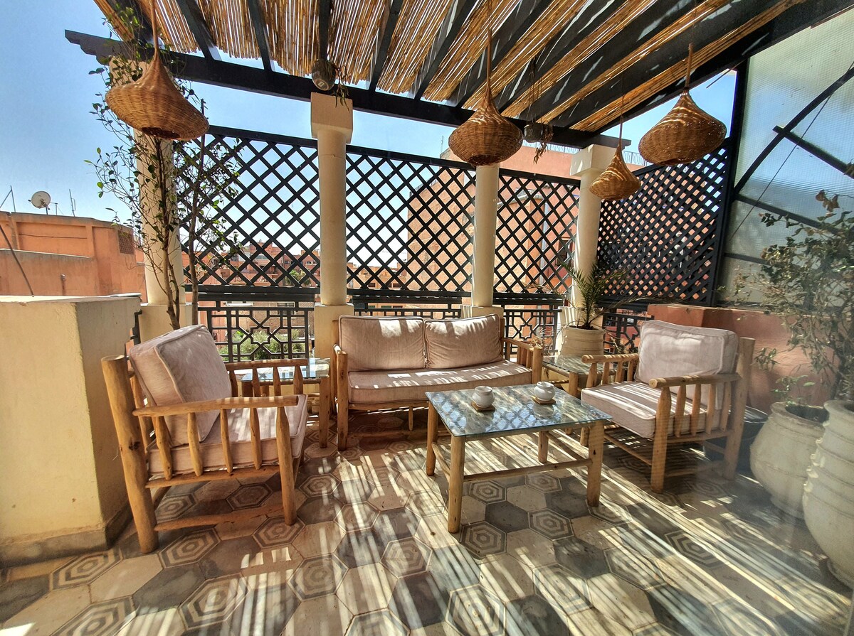 One bedroom apartment with large terrace, refurbished and tastefully decorated in a beldi chic style, on the fifth and top floor with elevator of a secure and very well maintained residence with caretaker in Guéliz. A stone's throw from Café de la Poste, a legendary café from the 1920s, and 250 m from Carré Eden, this apartment has the best location. It is located on a quiet street, opposite the General Treasury of the Kingdom, which allows you to enjoy the terrace and the unobstructed view