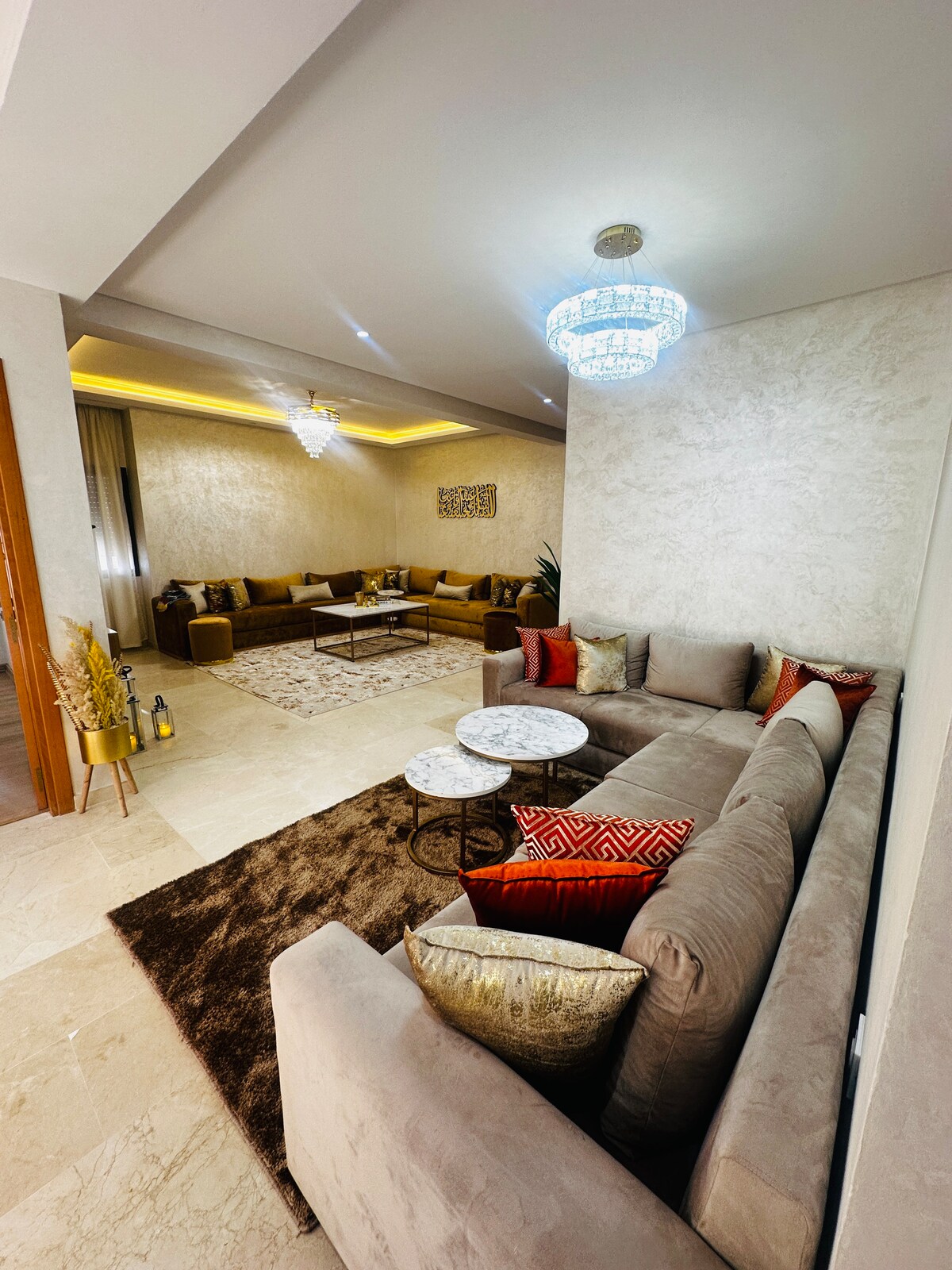 Bring the whole family to this great place with lots of room for fun. This luxurious 3-bedroom apartment is just a 10-minute walk from the beach and centrally located near the main area. Agadir Bay is only 5 minutes away on foot. Situated in a peaceful and secure neighborhood, the building offers 24/7 security. The spacious, family-friendly apartment features three double bedrooms and two living rooms, providing ample space for relaxation and comfort.
