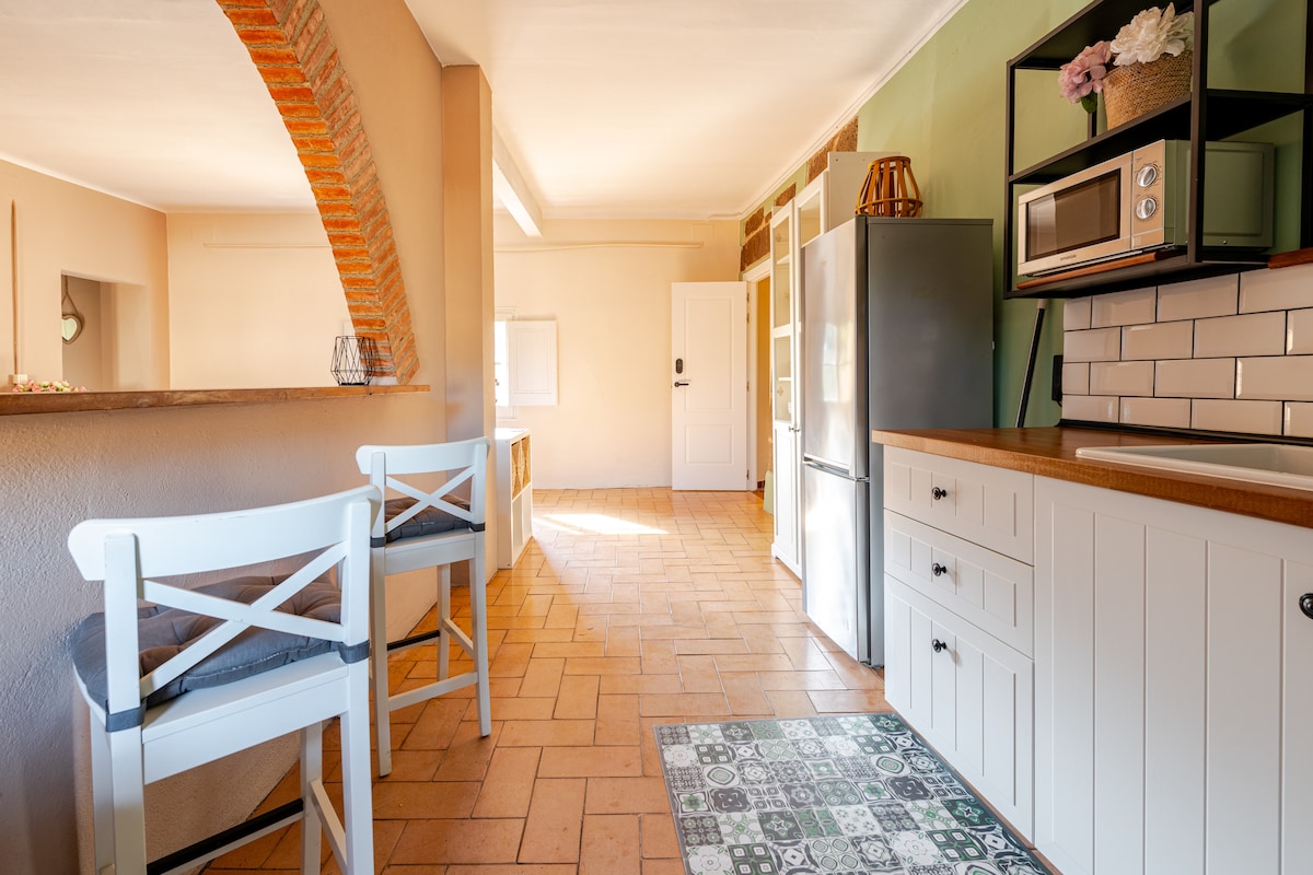 Characterful village cottage on a 6,000 m² family estate with four properties. SHARED swimming pool and garden, vegetable plot and 600 m² of nature. I've spent my summers here as a child; we now open it to new guests. You will be on the 1st floor of the house, which features a 40 m² kitchen, a 50 m² living room with a fireplace, and a 60 m² terrace surrounded by lush greenery. There is a table that seats 14, and 3 en-suite bedrooms with premium mattresses and new bed linen. Tranquillity, space and comfort near the Costa Brava, Monells, Pals, etc.