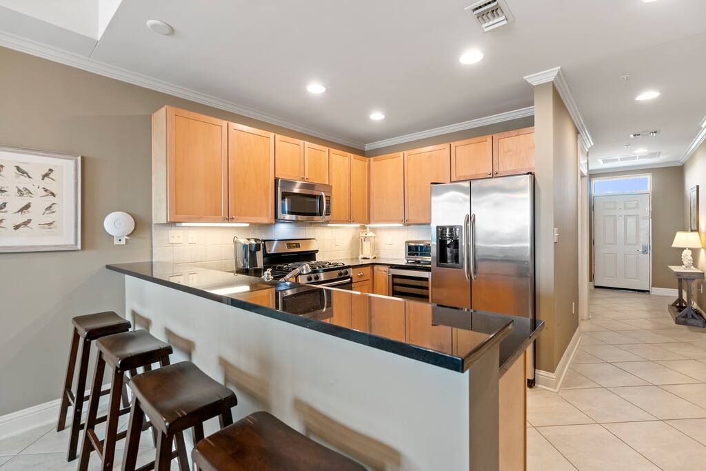 Have fun with the whole family at this beautiful & all newly updated condo at The Wharf! Sleeps up to 8 people (1 king, 2 queens & 1 queen sofa bed), garage parking, balcony with gas connected grill, beach umbrella, beach chairs, pack-n-play, kids plates, cups, utensils, washer/dryer, ice maker, wine fridge, coffee pot AND kuerig! Updated beautiful serene unit with kitchen seating for 8! Shampoos, soaps, paper products & garbage bags! The best board & card games! Smart TVs in every room!