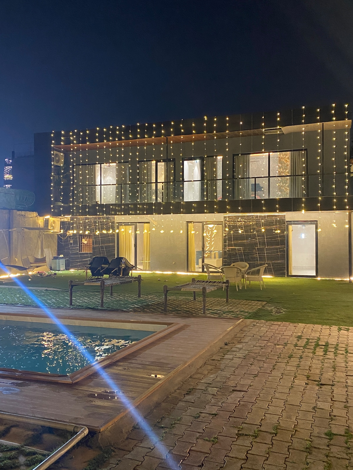 Wake up to greenery, spend your day by a private pool, and unwind under warm evening lights in your peaceful farmhouse in Gurgaon. Designed for staycations, small celebrations, and group getaways, this home offers open space, comfort, and privacy—just minutes from the city. ✔ Private pool with evening lighting ✔ Large lawn for gatherings & games ✔ Indoor living & dining for groups ✔ Ideal for families & small events Perfect for birthdays, weekend escapes, or simply slowing down with your people.