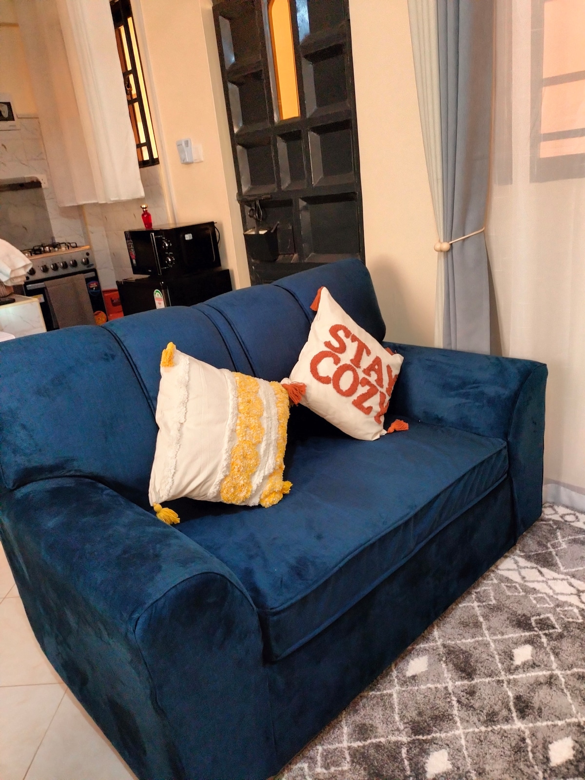 cozy,centrally located,family friendly studio offering a warm and welcoming retreat right in the heart of the city.Thoughtfully designed to make the most of its space,the studio features,a sleeping area,a small dining nook,sitting area ,a compact kitchennette&bathroom.Ample enclosed parking,high speed WiFi,hot shower,located just steps from public transport ,shops,Tsavo east national park allowing you to explore the city with ease and return to the cozy , quite place to unwind the day
