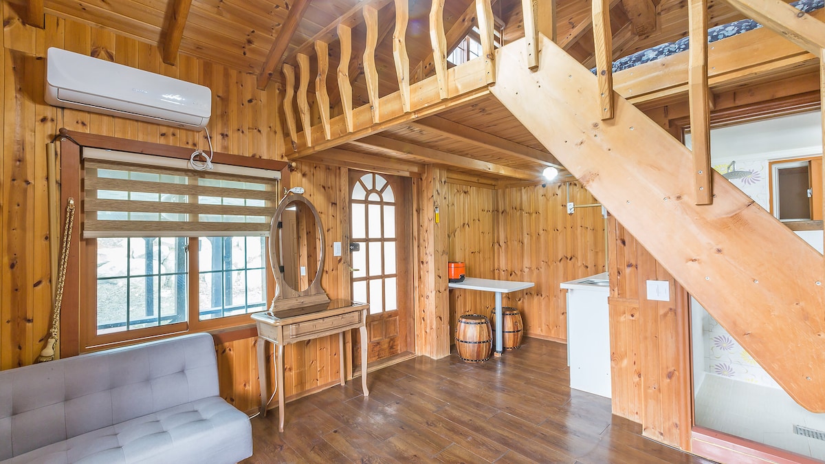 'Experience a special day in a small hut in nature where the years of time are buried!' We only have one team for those who are tired of city life and want to heal in nature. It is a Nordic-style, single-family, small wooden house. There is a garden with trees and the back is surrounded by a pine tree forest. When you enter the entrance made of stone walls, there is a small garden and a workshop (wooden house), and if you go down the stone stairs, there is an accommodation. You can feel the moist humidity and the scent of moss in the air. It was a space where I used to rest while working, but now I offer it to my guests. It is a very different atmosphere from the existing pension guest house. It is the best space for those who love nature and animals and enjoy a minimalist life.