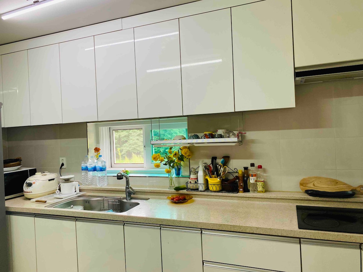 โโ In spring, you can take a walk with your family in the garden full of flowers, in summer, you can use the outdoor children's swimming pool alone without cost, with the sound of refreshing water flowing in the valley, and in autumn, you can enjoy the cool breeze and colorful leaves blowing from the valley. In winter, you can roast sweet potato nights on a campfire, and you can use a barbecue grill that can be used without cost. When it snows, walk down the path with your friends. โโ The 76m2 eco-friendly wooden house is fully equipped with amenities.In the hot summer, there are 2 air conditioners and fans in the living room and bedroom, and a Duratex cooling pad is also prepared on the bed. In addition, we prepared a Kuchen rice cooker and rice in the refrigerator so that you don't have to buy a half-cooked rice. Please come and prepare food at any time and spend a comfortable healing time. โโ There are Hwayang Valley, Seolunsan, Gongrimsa, and Sanmagi Old Road in the nearby streets, and there are Nonghyup, a large supermarket, Cheongcheon Traditional Market, a forest cafe, and a restaurant where you can have a delicious meal within 5 minutes.
