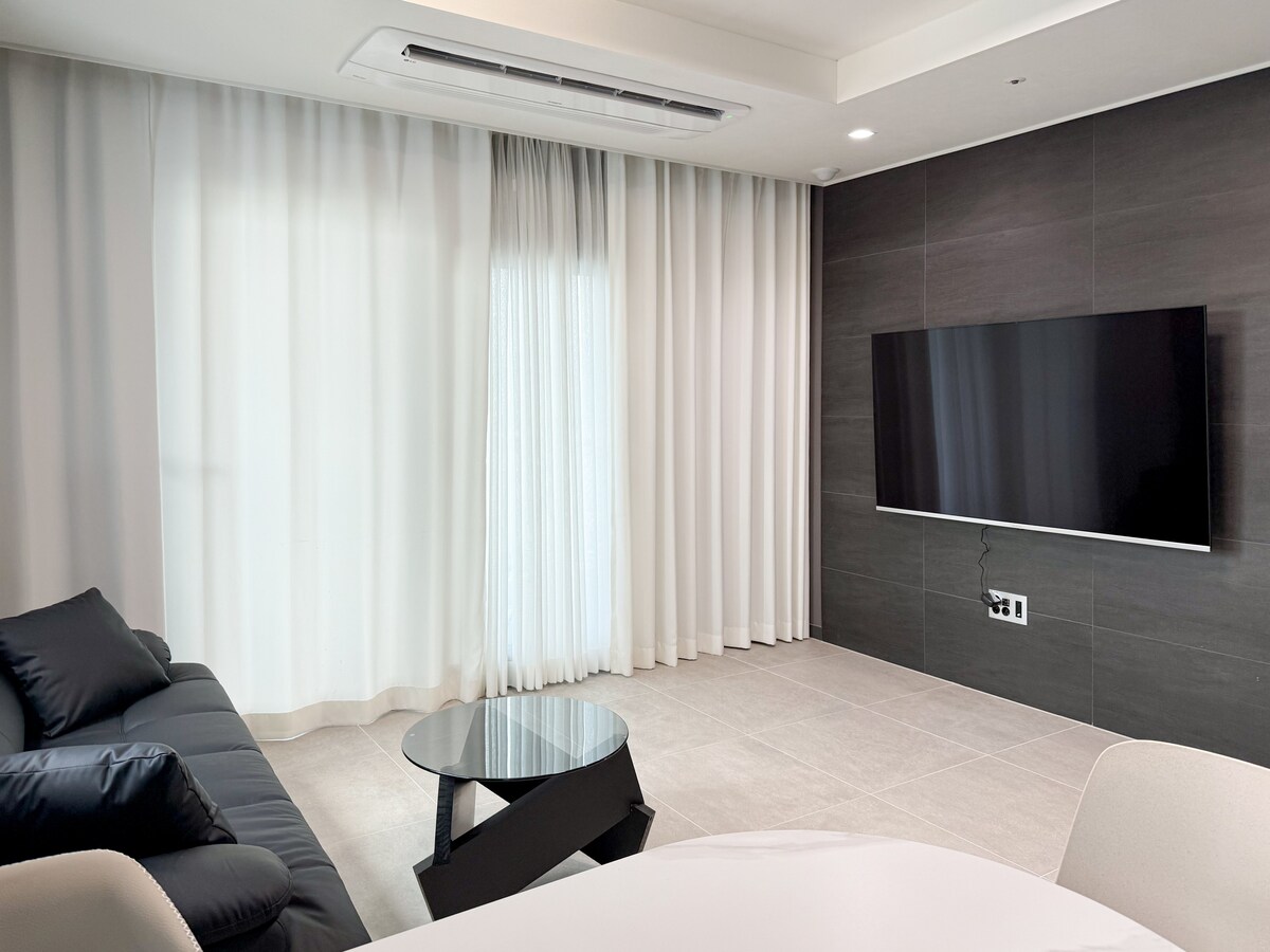 Have fun with the whole family at this stylish place. 8 minutes from Haeundae Station, 5 minutes from Haeundae Beach Cypress Aqua Pool to enjoy all four seasons All rooms have Smart TV installed. Large TV in the living room. Netflix, Retro Game, YouTube 2 toilets + powder room + washbasin in each room Interior full of modernity and natural beauty Arcade game machine (free) <Parking> Paid public parking lot within 3 minutes on foot (The daily rate is 15,000 won) <Free luggage storage service> Free luggage storage service available before and after check-in and check-out (Large carrier available) Operated with self door lock